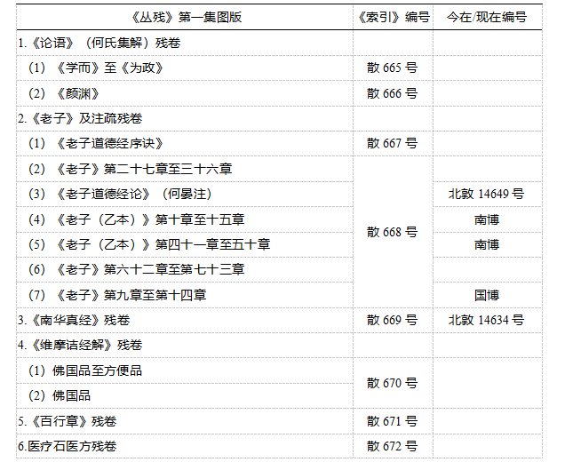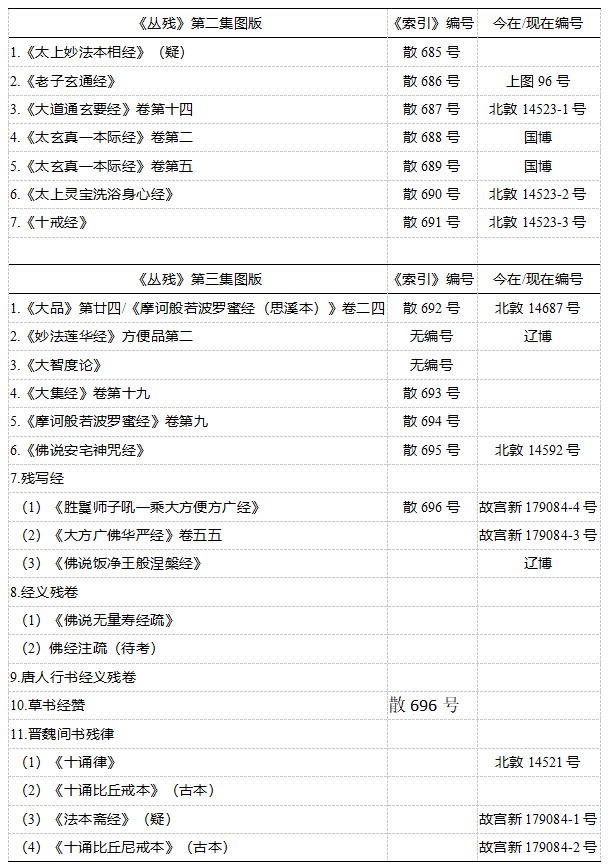 《丛残》编纂于敦煌学草创之初,不免带有时代局限性。首先是定名问题,《丛残》内辑印写卷数量不少,但每件影刊图版均未定名,且部分图版交错排布,偶有勾连,分辨不易。故而在过去,包括罗振玉本人在内的许多研究者对《丛残》内刊载的写卷内容只知其貌,不谙其详。定名缺失导致编目系统混乱。罗振玉辑印《丛残》时未编制目录,《全集》《初集》收录《丛残》后仅编制了简目,第一集为《论语》(何氏集解)等残卷18种27件,第二集为《残道家书》等6种6件,第三集为“晋魏间写本《大品》第廿四”等9种13件,凡33种46件。王重民《罗振玉藏敦煌卷子目录(依〈贞松堂藏西陲秘籍丛残〉)》编为散665—696号,较《全集》《初集》更为详备,但也存在将多个残卷笼统归置在一个编号下的弊端,如散668号《老子道德经》残卷六节、散681号“先天二年(713)”户籍二节、散683号“开元户籍”三残节、散696号残佛经二节等,都存在这个问题。林平和谓全书“分三集,收敦煌卷轴三十六类五十二残卷;若将误为《开蒙要训》之二种《太公家教》残卷分出,与‘魏晋间书残律’分成四种,则当为三十七类五十五残卷”。周常林称《丛残》为“私家收藏刊布的典范”,整理其目为第一集28种,第二集8种,第三集10种,凡46种。以上三家都对《丛残》所收写卷名目做了初步的梳理,但都不够彻底和全面。根据我们的检讨与爬梳,《丛残》内共有残卷(残片)35种95件,详见表1。
