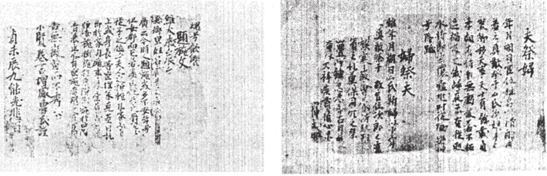 图1-2 《敦煌古籍零拾册》影印“题旐文”残片与“夫祭妇、妇祭夫”残片粘连在一起