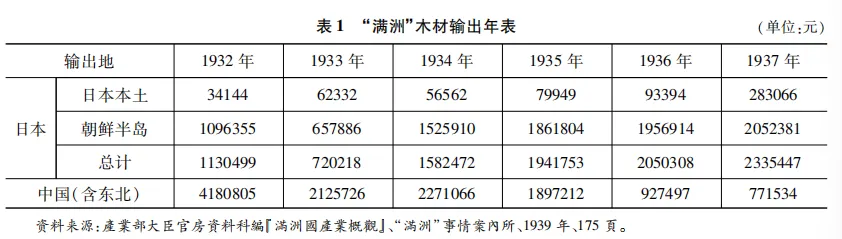 九一八事变后,日本占领东北,东北木材输出的路径发生整体性变化,运销到日本本土和朝鲜半岛的东北木材数量迅速增加,运销到华北和华东地区的数量急剧减少,导致花旗松木材输入中国的数量逐年增加,进而东亚地区的木材贸易格局发生显著变化。1931年9月后,日本迅速掌控了苏联控制下的东北森林和黑、吉、辽三省约144.1万公顷的国有林和大量公有林,几乎将中国势力排除在东北木材贸易各个重要环节之外,完全垄断了东北林木资源的采伐和运销。为了满足日本本土和朝鲜半岛的建设和扩大侵略战争的需要,日本开展林野实地调查和航空摄影调查,根据树种配置、地理状况、地方产业、交通运输等情况整理林场权,把东北森林划分为16个林野经营地区和125个林野事业区,利用鸭绿江采木公司、札免采木公司、中东海林采木公司、“满洲”林业株式会社等加大力度采伐林木,大量运销到日本本土、朝鲜半岛、伪满洲国和日占区。伪满洲国“外国”贸易年报对1932—1937年东北木材输出量进行统计,具体情况见表1。